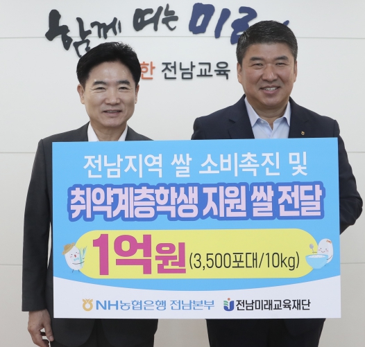 정재헌 본부장은 “맛과 품질이 우수한 우리 지역 쌀을 어려운 학생들을 위해 기탁 할 수 있어 기쁘다.”며 “농협은행은 전남의 대표 금융기관으로서 앞으로도 지역 교육 활성화를 위한 지원에 최선을 다하겠다.”고 밝혔다.