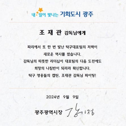 강 시장은 “파리에서 또 한 번 빛난 대표팀의 저력이 새로운 역사를 썼다”며 “따뜻한 리더십이 대표팀의 다음 도전에도 희망의 나침반이 되리라 확신한다”고 격려했다.