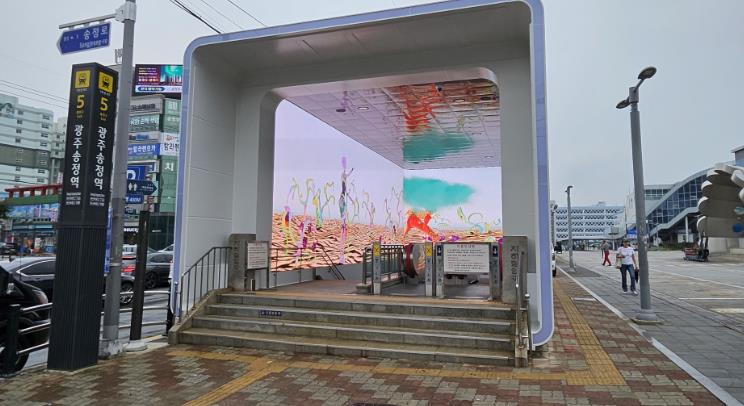 출구 옆 도로쪽은 교통에 방해되지 않도록 다양한 색깔의 콘텐츠를 제한하고 광주의 글귀, 광주시 로고를 형상화한 이미지 등을 채도가 낮은 단색으로 간결하게 표현했다.