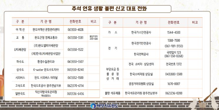 가스와 전기 등 생활 필수 에너지의 안정적인 공급을 위해 관계 기관과 합동으로 안전 점검을 실시하고, 연휴 기간에는 가스안전공사와 전기안전공사, 한국전력공사 완도?강진?고흥지사가 상황실을 운영하여 불편 사항을 접수·처리한다.