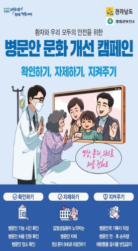 환자를 포함한 영암군민, 귀성객 모두의 안전을 위해서 병문안 시간·허용인원·장소 ‘확인하기’, 노약자 병문안 ‘자제하기’, 병문안 기록 작성·위생 ‘지켜주기’ 등이 골자다.