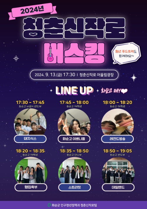 버스킹 무대는 화순고 댄스부, 밴드부 등이 총출동하여 대중가요, 트로트, 방송댄스 등 다양한 장르의 무대를 선보일 예정이다.