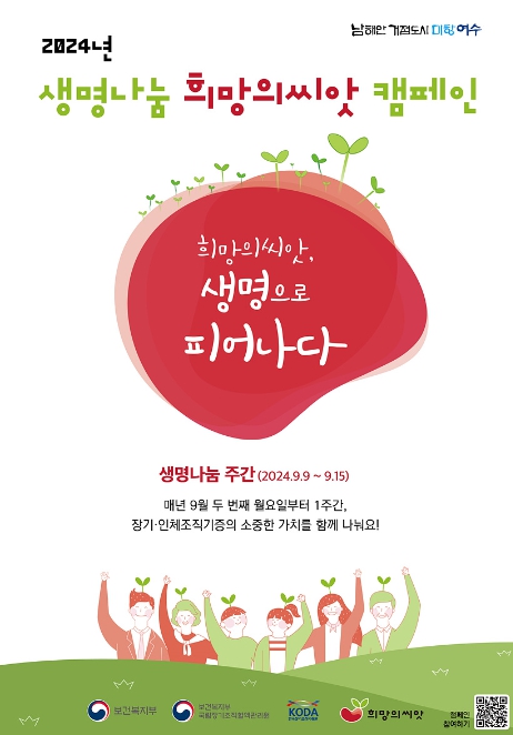 | 여수시(시장 정기명)는 제7회 생명나눔 주간(9. 9.~9. 15.)을 맞아 ‘희망의 씨앗, 생명으로 피어나다’ 주제로 캠페인을 실시한다. |