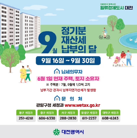 조중연 대전시 세정담당관은“납부 마감일에는 금융기관 혼잡 및 ARS 접속량이 많아 납부가 원활하지 않을 수 있다”라며 “가급적 말일을 피해 기한 내 납부해 주시길 바란다”라고 당부했다.
