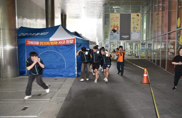 이들은 문화전당 지하 3층 전기차 충전소에서 발화한 대형화재로 차량이 전소되고 다수의 사상자가 발생한 상황을 가정해 신속·정확한 상황전파와 초기대응, 화재진압, 인명구조, 수습·복구 단계로 나눠 진행했다.