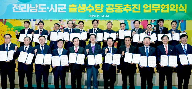 | 전라남도가 올해를 ‘지방소멸 극복 원년’으로 삼아 인구문제 해결을 위해 전방위 노력을 펼치고 있다. 김영록 전라남도지사와 22개 시장·군수들이 지난 2월 14일 도청에서 전남·시군 출생수당의 성공적 추진을 위한 업무협약을 하는 모습 |