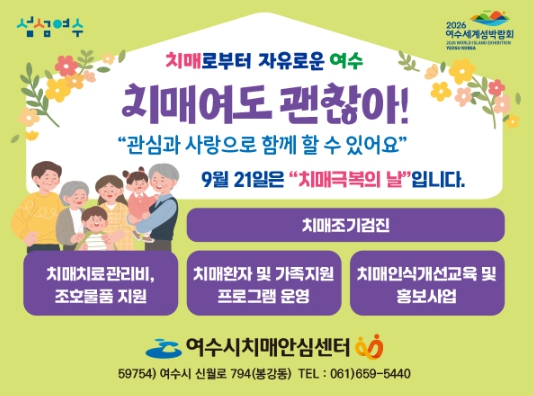 시 관계자는 “치매로부터 자유로운 여수를 목표로 치매 예방을 위한 조기 검진의 중요성을 널리 알리고, 치매가 있어도 안심할 수 있도록 환자와 그 가족을 위한 지원을 아끼지 않겠다”고 전했다.