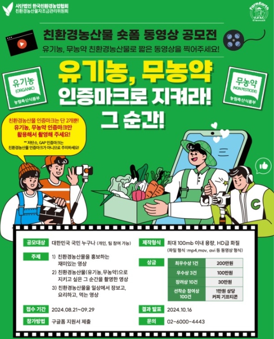 공모 주제는 친환경 농산물을 홍보하는 재미있는 영상, 친환경 농산물로 지키고 싶은 순간을 촬영한 영상, 친환경 농산물을 일상에서 장보고, 요리하고, 먹는 영상, 세 가지다.