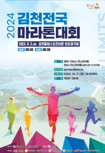 이번 대회는 2023년도와 같이 하프(20km), 10km, 5km 등 총 3개 종목으로 치러지며, 대회 당일인 11월 3일 오전 9시 30분부터 김천 종합스포츠타운 보조경기장에서 출발한다.