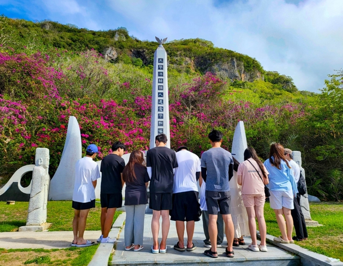 | 지오학교 활동팀 ‘노스탤지어’ 학생들이 태평양 전쟁에 동원돼 희생된 한국인 추모탑 앞에서 참배하고 있다. |