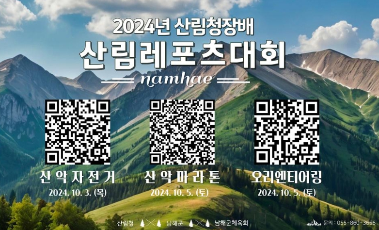 이번 대회는 (오리엔티어링) 10월 5일 개최, 9월 28일까지 신청 접수 ?(산악자전거) 10월 3일 개최, 9월 30일까지 신청 접수 ?(산악마라톤) 10월 5일 개최, 9월 30일까지 접수하며 참가 신청은 대한오리엔티어링연맹, 더바이크, 한국산악마라톤연맹 누리집 신청 또는 홍보포스터 내 QR코드 활용으로 하면 된다.