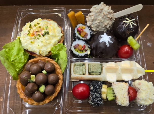 구성 메뉴는 역전시장을 대표하는 떡집을 활용한 기정떡와플과 앙금떡김밥, 새벽시장에서 나오는 야채를 활용한 감자샐러드타르트, 표고버섯을 형상화한 초콜릿 등이다.