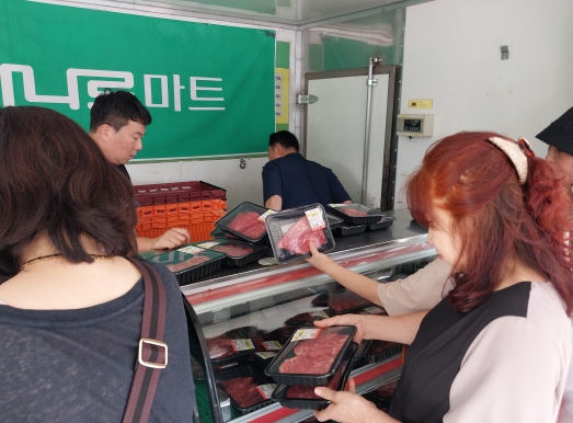 | 강진완도축협 이동판매차량에서 소비자가 강진 한우고기를 구입하고 있다. |