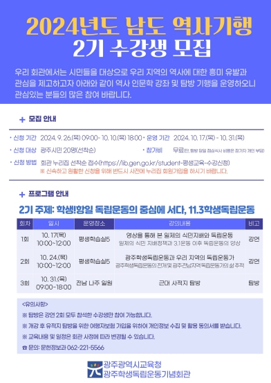 ‘남도 역사기행 2기’는 11월 3일 학생독립운동기념일을 맞아 마련됐다. 특히 ‘학생, 항일 독립운동의 중심에 서다, 11·3학생독립운동’을 주제로 오는 10월 17일부터 31일까지 매주 목요일 총 3회에 걸쳐 운영될 예정이다.