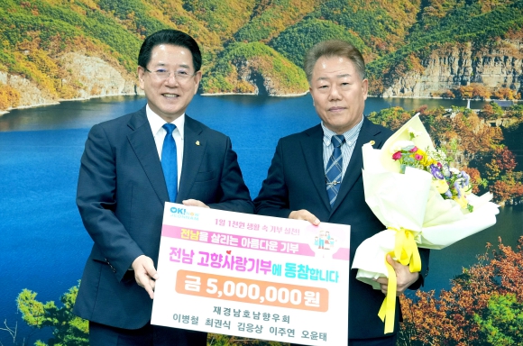 | 김영록 전라남도지사가 23일 도청 접견실에서 재경남호남향우회 이병철 회장으로부터 고향사랑기부금을 기탁받고 기념촬영을 하고 있다. |