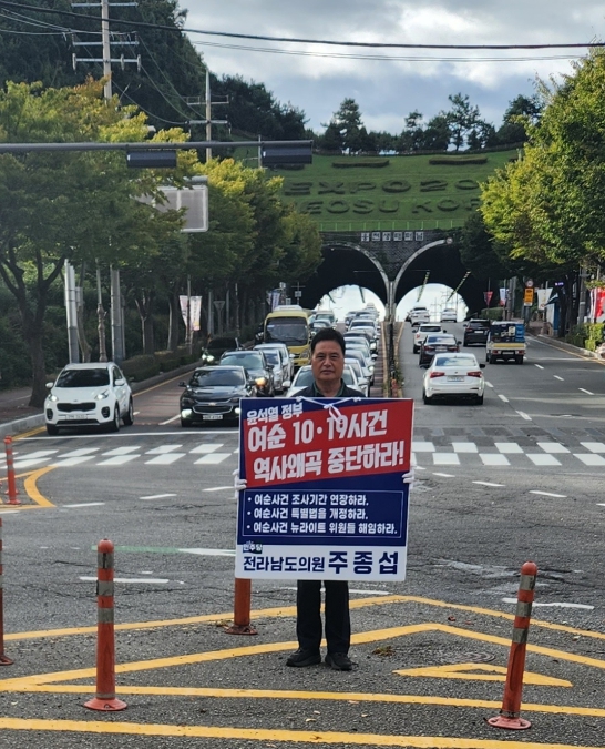 | 주종섭 의원이 지난 23일 여순 10·19사건 역사왜곡 중단을 촉구하는 1인 시위를 진행하고 있다 |