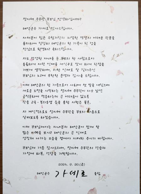 가 군수는 서한문을 통해 “훌륭하게 자란 인재를 새식구로 맞이하게 된 점을 기쁘게 생각하며 귀한 인재로 잘 길러주신 부모님의 노고에 무한한 존경과 감사를 드린다”고 언급했다.