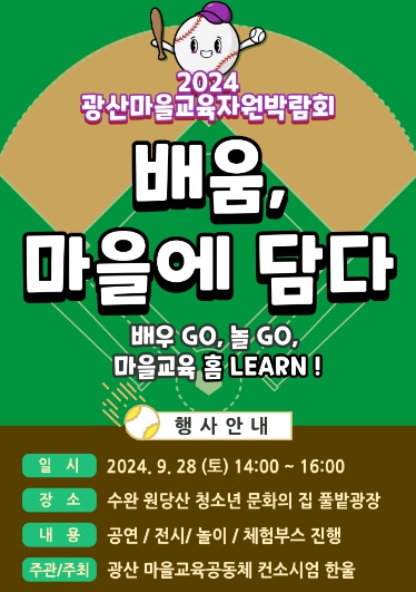광주시 ‘마을교육공동체 지원사업’을 바탕으로 올해 광산구 곳곳에서 청소년, 학부모, 교사, 마을 주민이 함께 배우고, 소통하며 공동체로 성장한 과정을 담은 전시와 더불어 놀이, 생태, 역사, 자원순환 등 다채로운 배움의 장을 체험할 수 있는 프로그램을 운영한다.