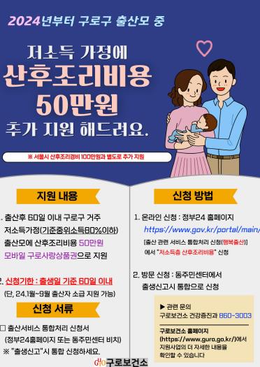 저소득층에 대한 구로구의 산후조리비용 지원은 서울시 산후조리경비 100만 원과는 별도로 전액 구비를 투입해 추진하는 사업으로, 구가 지원하는 산후조리비용 50만 원은 모바일 구로사랑상품권으로 지급된다.