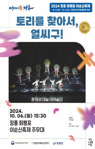 장흥군 관계자는 “2024년 회령포 이순신 축제 기간동안 개최되는 풍악광대놀이예술단 ‘토리를 찾아서, 얼씨구!’공연에 군민들의 관심과 참여를 바라며 앞으로도 다양한 장르의 공연이 개최될 수 있도록 노력할 것”이라고 전했다.