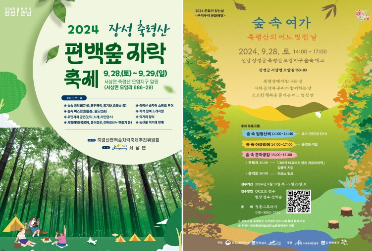 먼저, 서삼면 금빛휴양타운 인근(모암리 686-29)에서 28~29일 열리는 ‘장성 축령산 편백숲자락축제’에선 숲속 음악회와 버스킹, 공연, 체험 프로그램 등이 다채롭게 마련된다. 특히, 편백숲을 거닐며 참여할 수 있는 ‘축령산 숲자락 스탬프 투어’가 관심을 모으고 있다. 출출함을 달래 줄 먹거리장터도 운영된다.