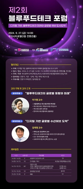 이번 포럼에서는 '디지털 기반, 블루푸드테크의 미래와 글로벌 허브 도시 도약'이라는 주제로 '블루푸드테크' 산업 선도를 위한 특강이 진행된다.