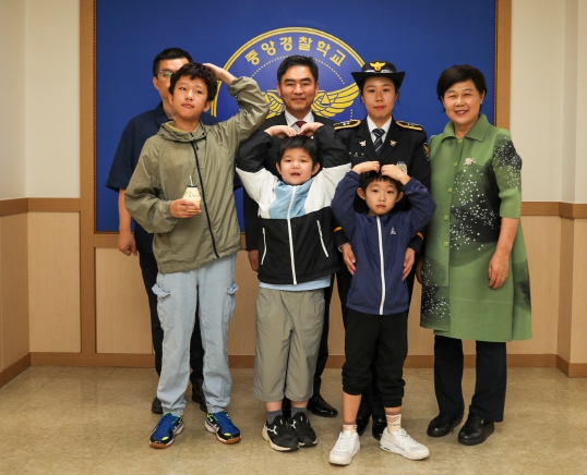 | 윤은정 순경 및 가족들(어머니 남편 세 아들)과 기념촬영- 뒷줄 왼쪽부터 남편, 조상명 국정상황실장, 윤은정 순경, 어머니 |
