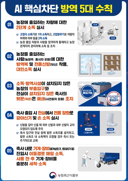 16개소 30지점의 주요 철새도래지 진입을 통제하고, 시군과 농협의 소독차량 134대를 총동원해 매일 철새도래지와 야생조류 항원 검출지점 주변 도로, 농장 진입로 소독을 강화한다. 또한 방역에 취약한 고위험 오리농가에는 겨울철 일시적으로 사육을 제한해 고병원성 조류인플루엔자 발생 위험 저감에 힘쓴다.