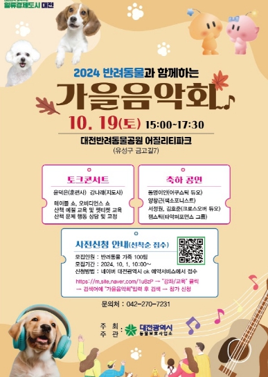 가을음악회에 참여하고 싶은 반려동물 가족은‘대전OK예약서비스’에서 10월 1일부터 13일까지 예약 신청을 하면 된다.