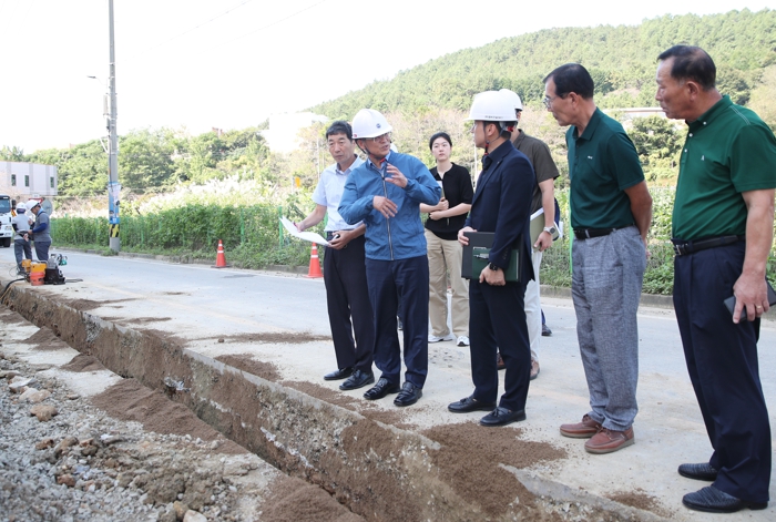 | 강진원 군수가 지난 9월 27일 서문마을 공사 현장을 방문해, 관계자들로부터 설명을 듣고 있다. |