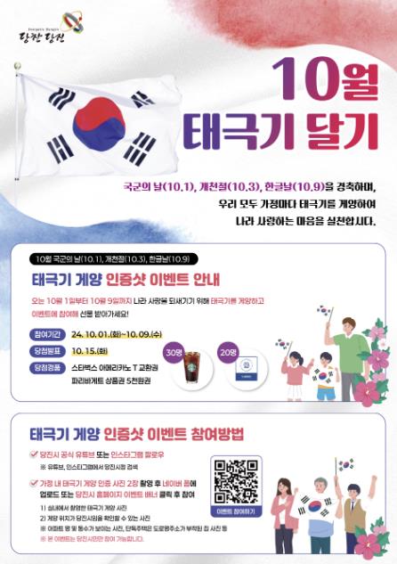 시에 따르면 10월 초에 집중된 기념일과 국경일을 맞아 공동주택에서 태극기 게양할 수 있도록 적극적으로 홍보하고, 태극기 게양 인증샷 이벤트 참여 안내는 시 누리집과 블로그를 통해 확인할 수 있다.