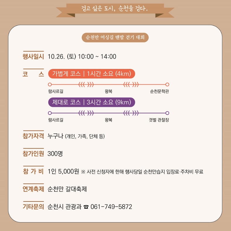 걷기 코스는 왕복코스로 걷기 초보자를 위한 4km 코스와 순천만의 자연을 제대로 느낄 수 있는 9km 코스를 운영한다. 4km 코스는 무진교에서 스카이큐브 순천만역까지 이어지는 갈대열차길을 따라 천혜의 자연과 문화를 체험할 수 있는 구간이다. 9km 코스는 순천만 해안가 뚝방길을 따라 갯벌과 갈대를 감상하며 걸을 수 있는 힐링코스이다. 완보자에게는 뽑기를 통해 순천시 캐릭터인 ‘루미뚱이’ 관광굿즈 등 소정의 기념품도 제공할 예정이다.