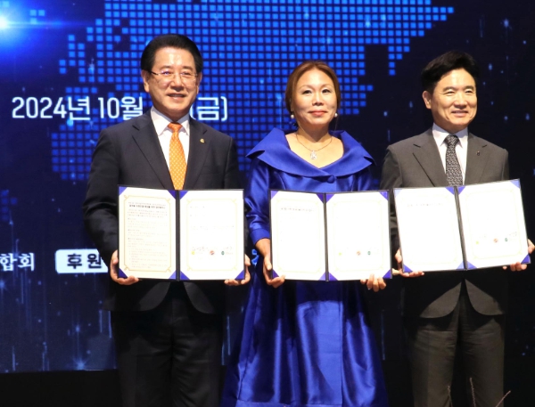 | 김영록 전라남도지사가 4일 오후 신안 라마다 호텔에서 개최된 “2024 세계호남인의 날 기념대회”에 참석해 김대중 전라남도 교육감(전남미래교육재단 이사장), 이기자 세계호남향우회총연합회장과 호남 미래인재 육성을 위한 업무협약을 체결하고 있다. |