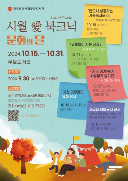 송경희 시립도서관장은 “독서하기 좋은 계절 가을을 맞아 가족들과 함께 소풍 오는 마음으로 도서관을 찾아주길 바란다”며 “‘시월 애(愛) 북크닉 행사’를 통해 시민의 마음이 더 풍성해지는 계기가 될 것”이라고 말했다.