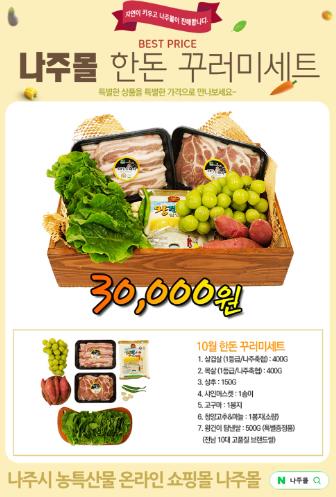 나주축협 1등급 삼겹살(400g)·목살(400g)에 상추·샤인머스켓·고구마 등 로컬푸드 8종으로 구성돼 온가족이 영양 가득한 한 끼 식사를 즐길 수 있다.