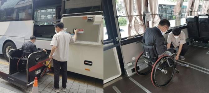 | 장애인버스를 이용해 이동하는 휠체어 이용 장애인 |