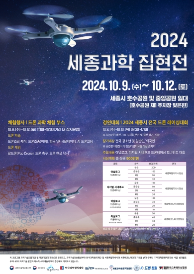 2024 세종과학집현전은 '한글, 과학, 음악'을 주제로 세종시민 모두가 함께 참여하고 즐기는 2024 세종축제와 연계하여, 과학기술(드론)과 소통할 수 있는 체험행사와 경연대회로 개최된다.