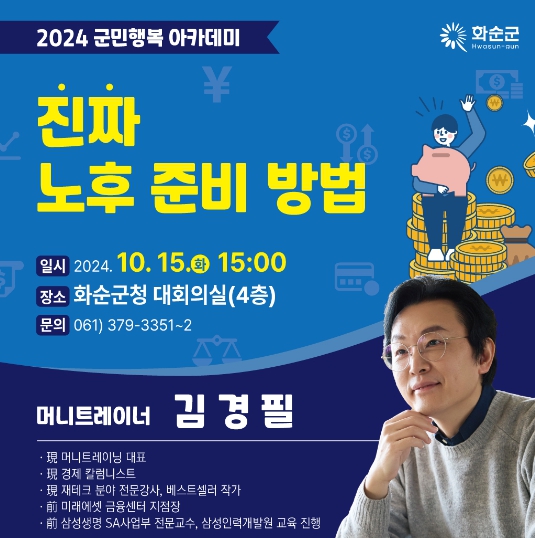 조미화 인구청년정책과장은 “고물가와 경기침체 속에서 안정된 노후와 미래의 삶을 준비할 수 있는 재테크 방법과 경제적 생존법에 대해 들을 수 있는 좋은 기회로 사회 초년생부터 예비 퇴직자까지 누구에게나 유익한 강연이 될 것”이라며 “군민 여러분의 많은 관심과 참여 부탁드린다.”라고 전했다.