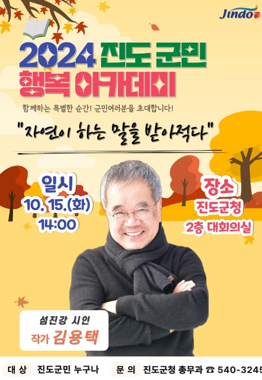 진도군 관계자는 “진도 군민행복 아카데미는 사전 신청 없이 누구나 입장 가능하다”며, “오색찬란 단풍의 계절 10월, 아카데미 강연에 참석하셔서 풍성한 마음의 열매를 맺으시길 바란다”고 말했다.