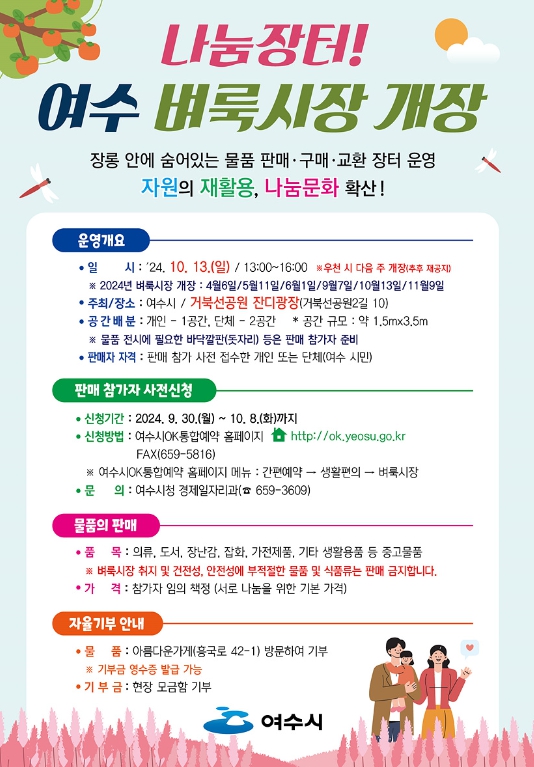 한편, ‘여수 벼룩시장’은 자원순환 촉진을 위해 매년 6회 운영되고 있으며, 지난 9월 벼룩시장에는 154개 팀이 참여해 1,400여 개의 중고 물품을 거래했다.