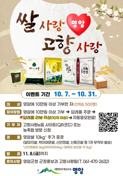 영암 쌀 판매와 고향사랑기부 촉진을 병행하는 이 이벤트는, 답례품에 3만원 상당의 영암 쌀을 추가로 제공하는 내용.
