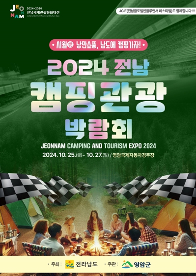 캠핑용품과 장비 등 캠핑의 모든 것을 즐기고 카트 체험과 케이팝 콘서트 등 즐길거리도 풍성한 전남캠핑관광박람회는 전라남도가 주관하고 영암군이 주최한다. 5만여 관광객과 100여 기업이 참여할 것으로 예상된다.