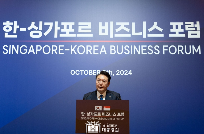 | 10월 8일 윤석열 대통령은 싱가포르의 시내 호텔에서 열린 ?한-싱가포르 비즈니스 포럼?에 참석했다. |