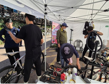 | 지난 3~5일 진행된 불광천 은평누리축제에서 진행한 ‘찾아가는 자전거 점검 및 수리센터’ 모습 |