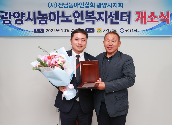 | 임형석 전남도의원이 10월 7일, 광양시농아노인복지센터 개소식에서 (사)전남농아인협회 김재철 광양시지회장에게 감사패를 받고 함께 기념사진을 찍고 있다. |