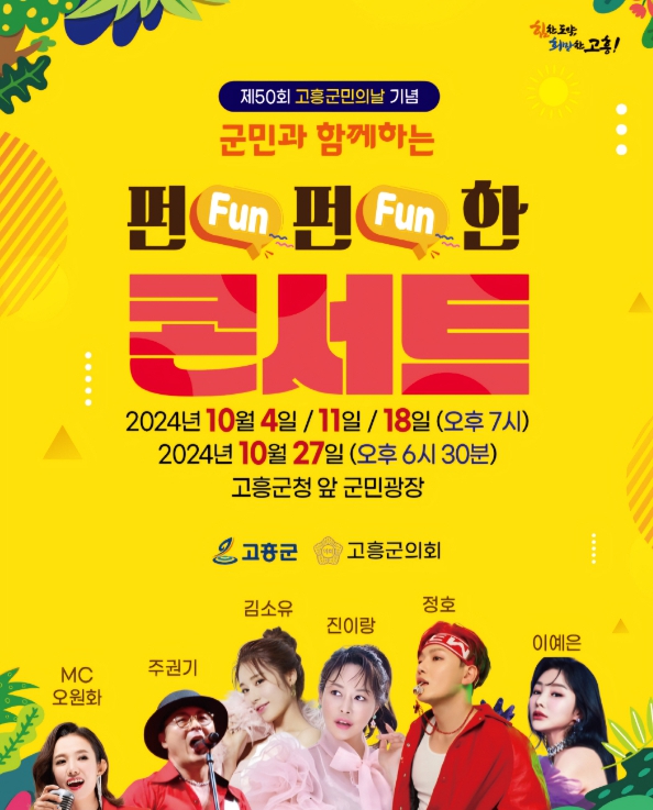 한편, 고흥군은 10월 한 달간 진행되는 ‘펀펀한 콘서트’ 외에도 ‘녹동항 드론쇼 거리공연(버스킹)’과 ‘수상한 외갓집’ 뮤지컬 공연 등 지역맞춤형 중소규모 콘텐츠 유통 사업 공연을 11월 말까지 진행할 계획이다.