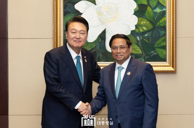 | 10월 10일 아세안 관련 정상회의 참석을 위해 라오스 비엔티안을 방문 중인 윤석열 대통령은 「팜 밍 찡(Pham Minh Chinh)」 베트남 총리와 회담을 가졌다. |
