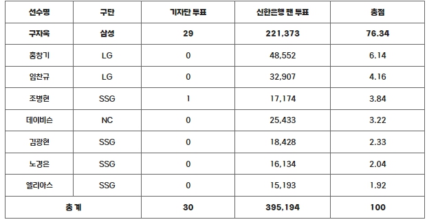 구자욱은 기자단 투표 30표 중 29표(96.7%), 팬 투표에서 395,194표 중 221,373표(56.0%)를 받아 총점 76.34점을 획득, 팬 투표 48,552표를 받아 총점 6.14점으로 2위를 차지한 LG 홍창기를 제치고 최종 1위에 올랐다. 구자욱은 2012년 프로 입단 후 12년만에 처음으로 월간 MVP를 수상하게 됐다.