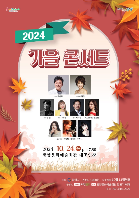 김명덕 문화예술과장은 “2024 가을 콘서트는 풍성한 가을 시민들께 안겨드리는 종합선물세트 같은 공연이 될 것이다”라며 “일상에 지친 시민들이 활력을 재충전할 수 있도록 앞으로도 다채로운 공연을 선보이겠다”라고 밝혔다.