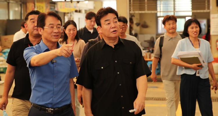 | 지난 8월 14일, ㈜더본코리아 백종원 대표 및 관계자들이 강진원 군수와 함께 강진읍시장 수산동을 방문했다. |